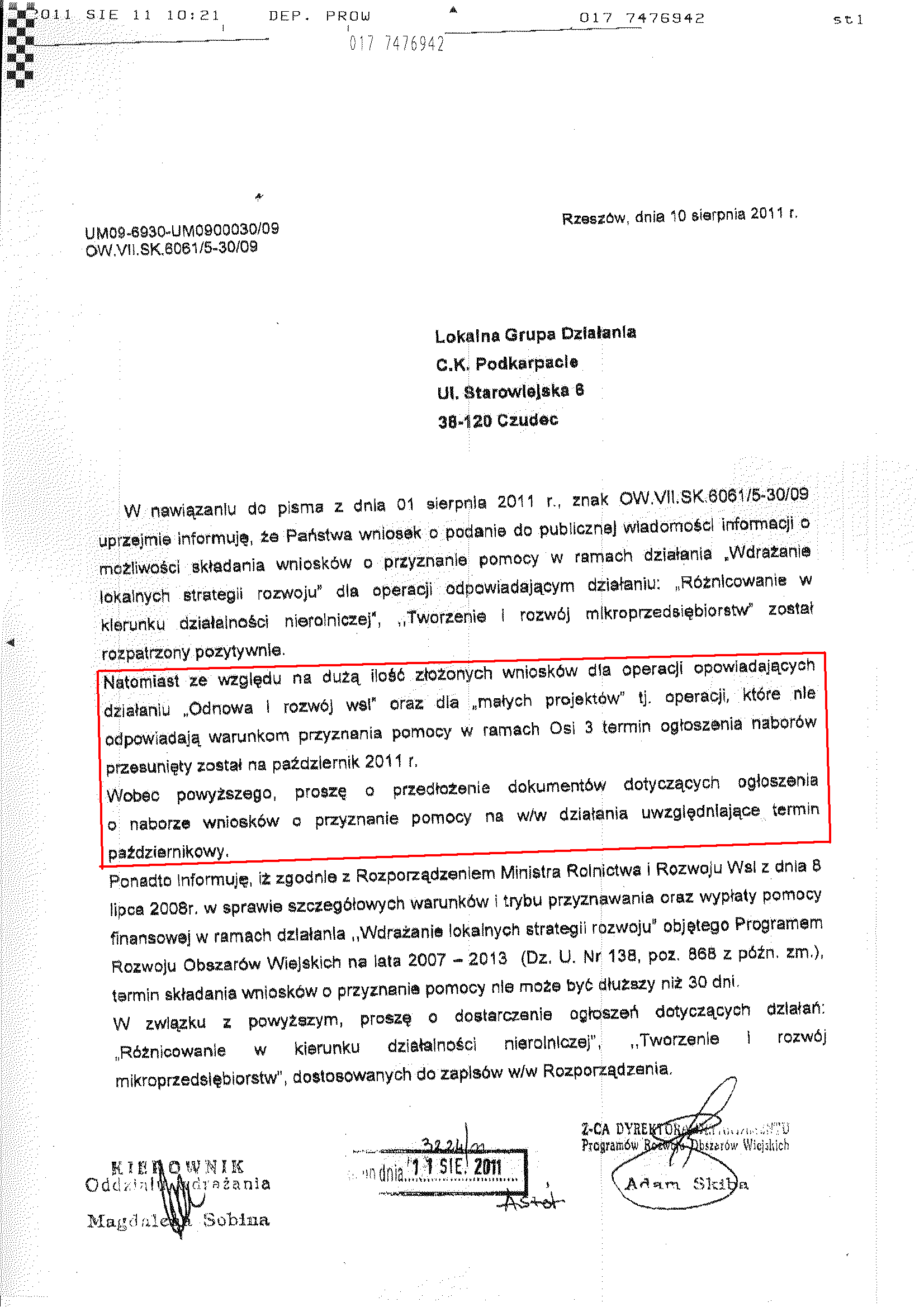 Wnioski składać należy w terminie od 12.09.2011 do 09.10.2011 w Biurze LGD.