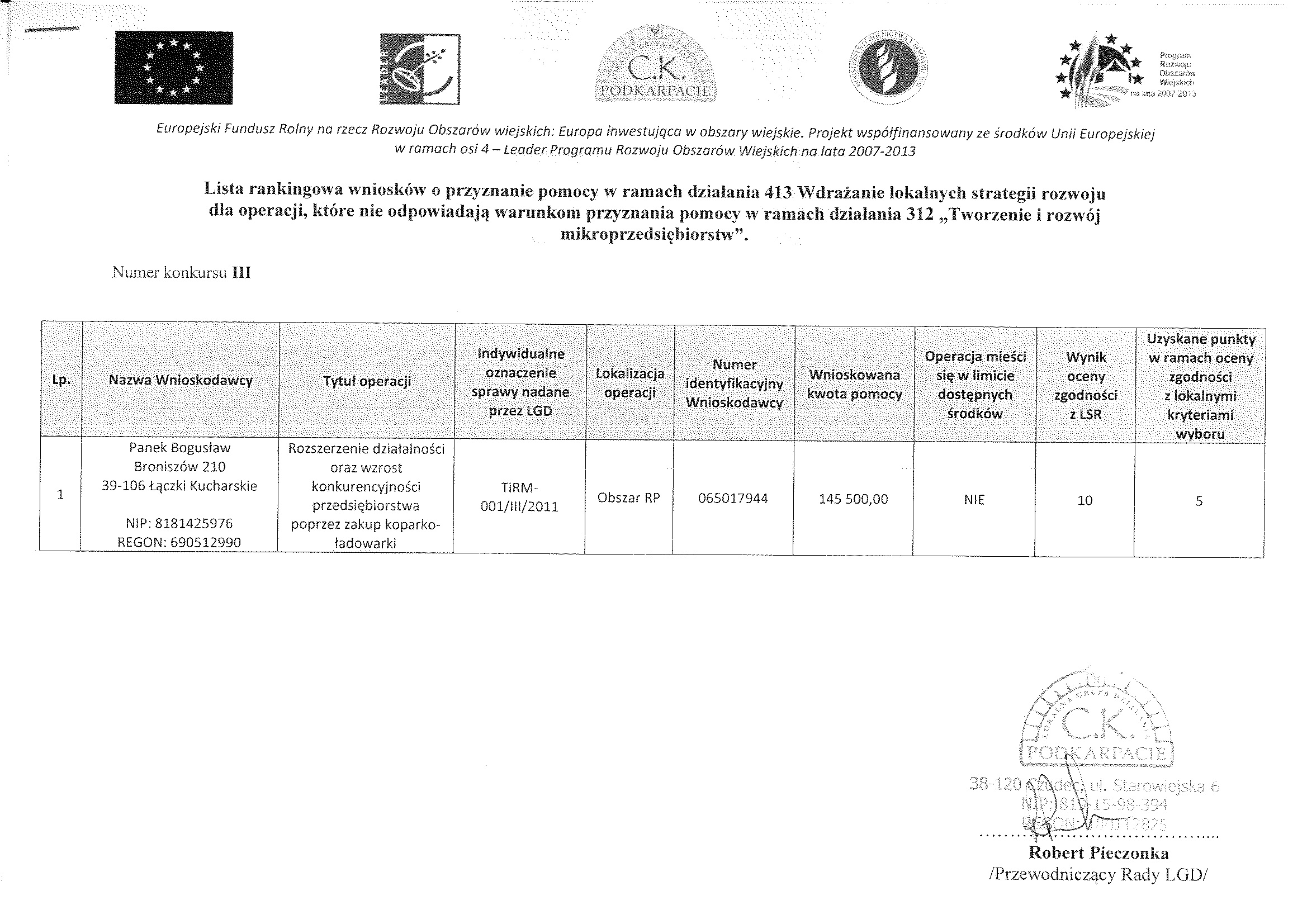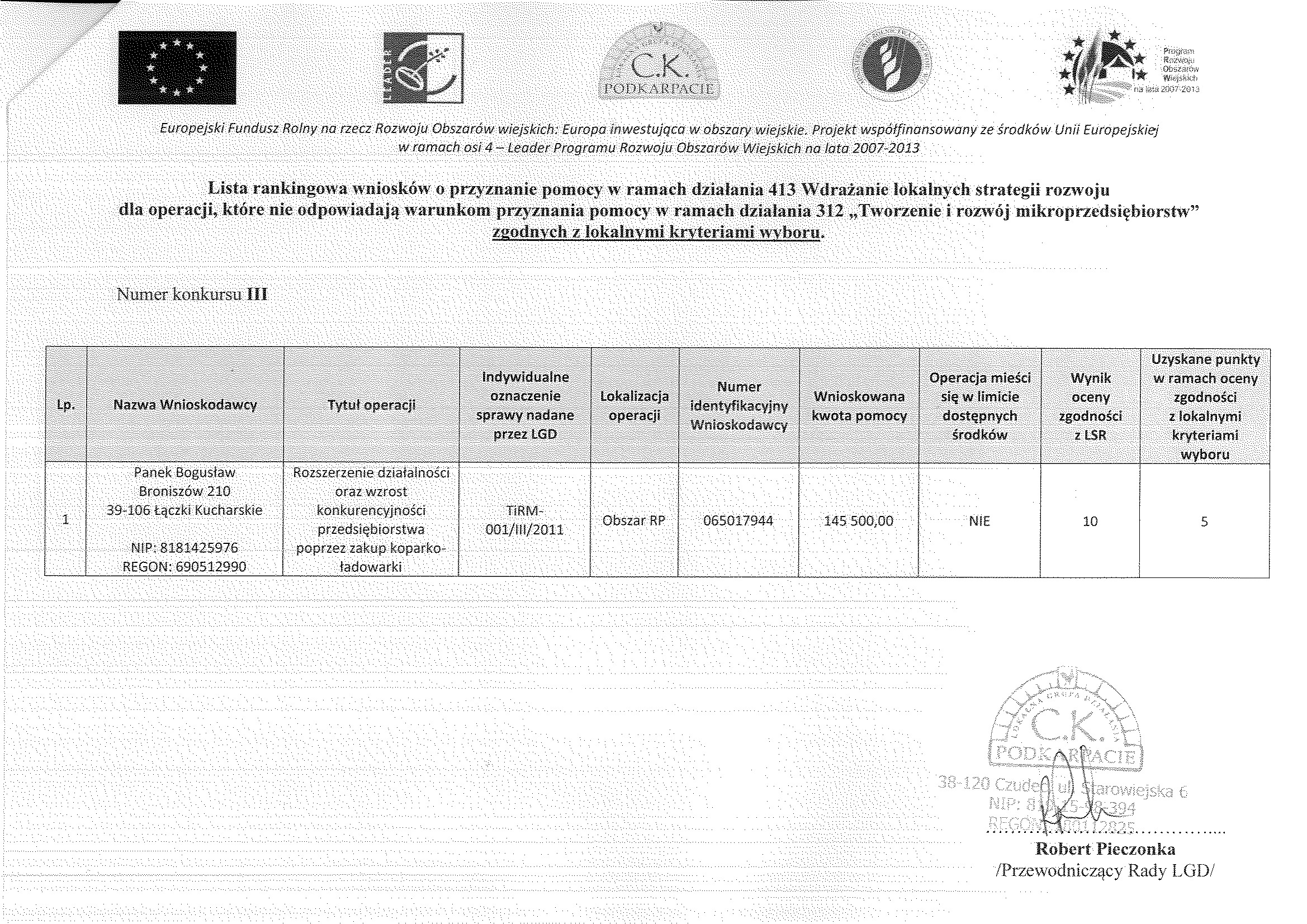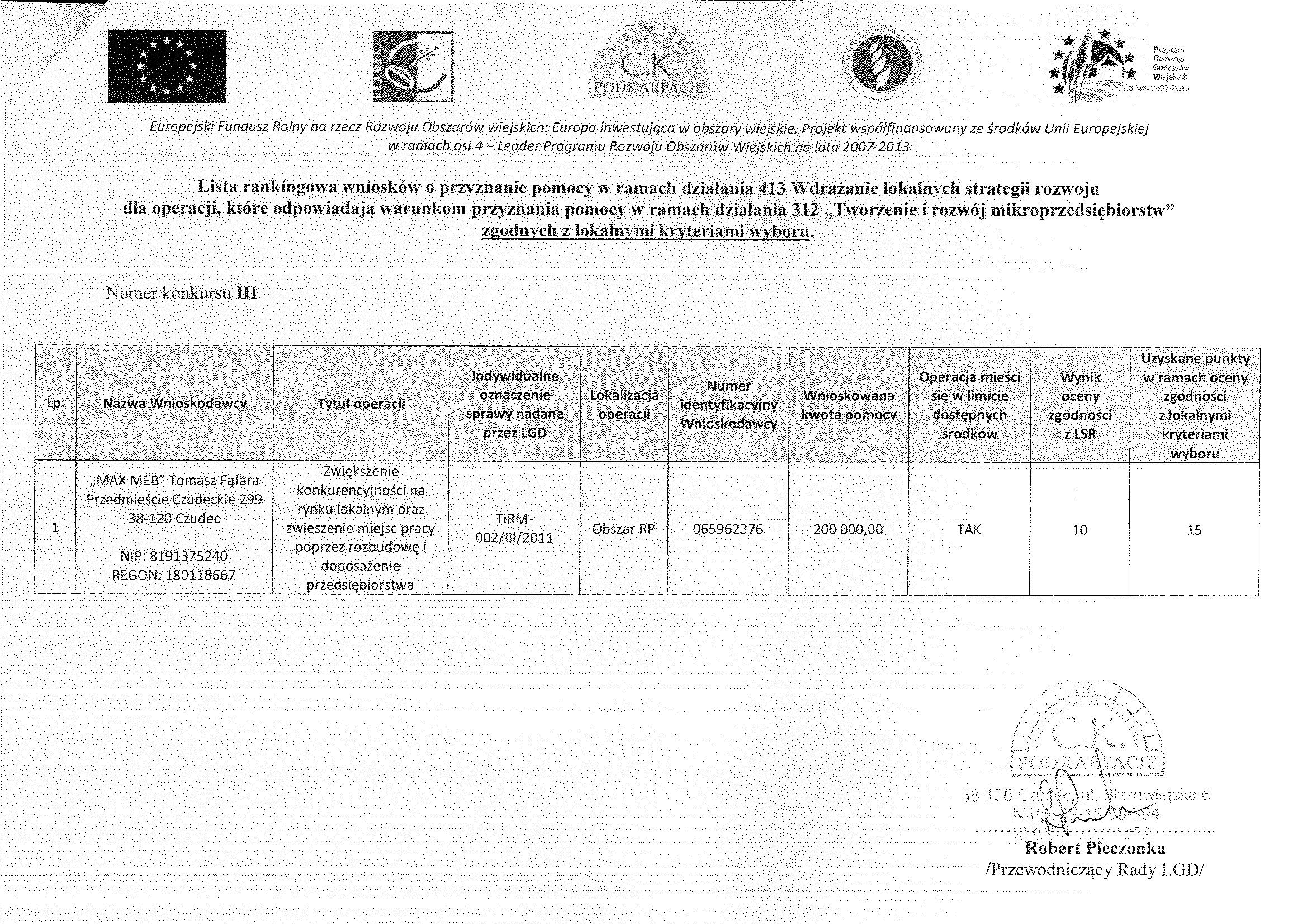Lista rankingowa dla operacji, które odpowiadają warunkom przyznania pomocy w ramach działania 312 „Tworzenie i rozwój mikroprzedsiębiorstw” zgodnych z Lokalnymi Kryteriami Wyboru